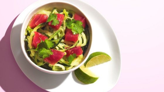 Simple, fresh, and delicious, this Ideal Protein tuna poke bowl recipe is a fabulous lunch or dinner for anyone following a weight loss program, or any tuna poke bowl fans. If you like ginger, try mixing a little extra in with the soy sauce to serve alongside.